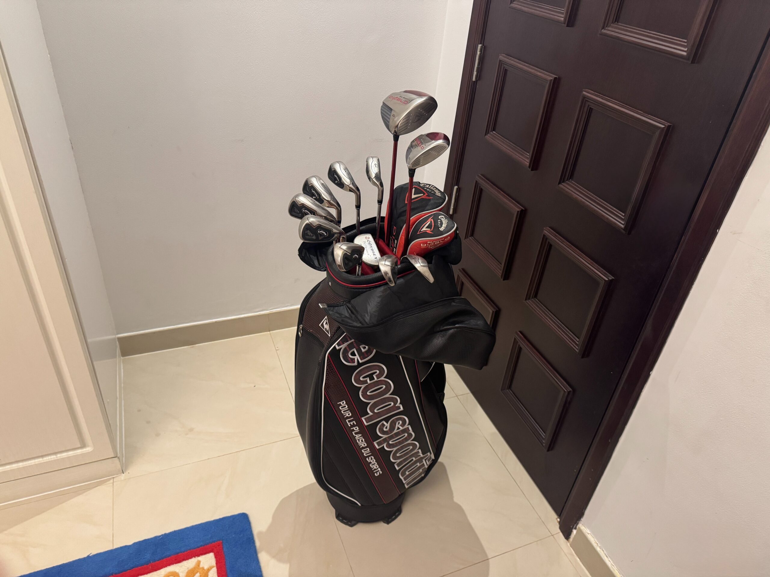 - Le Coq Sportif 6-Way Cart Bag Golf Bag, Dark Red/Black/White Colourway, With Rain Hood Cover and Shoulder Strap, 6-Way Partition