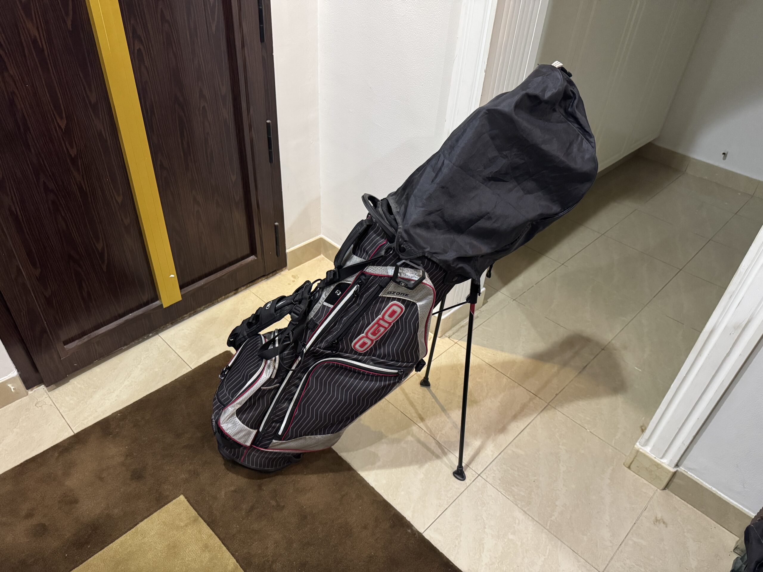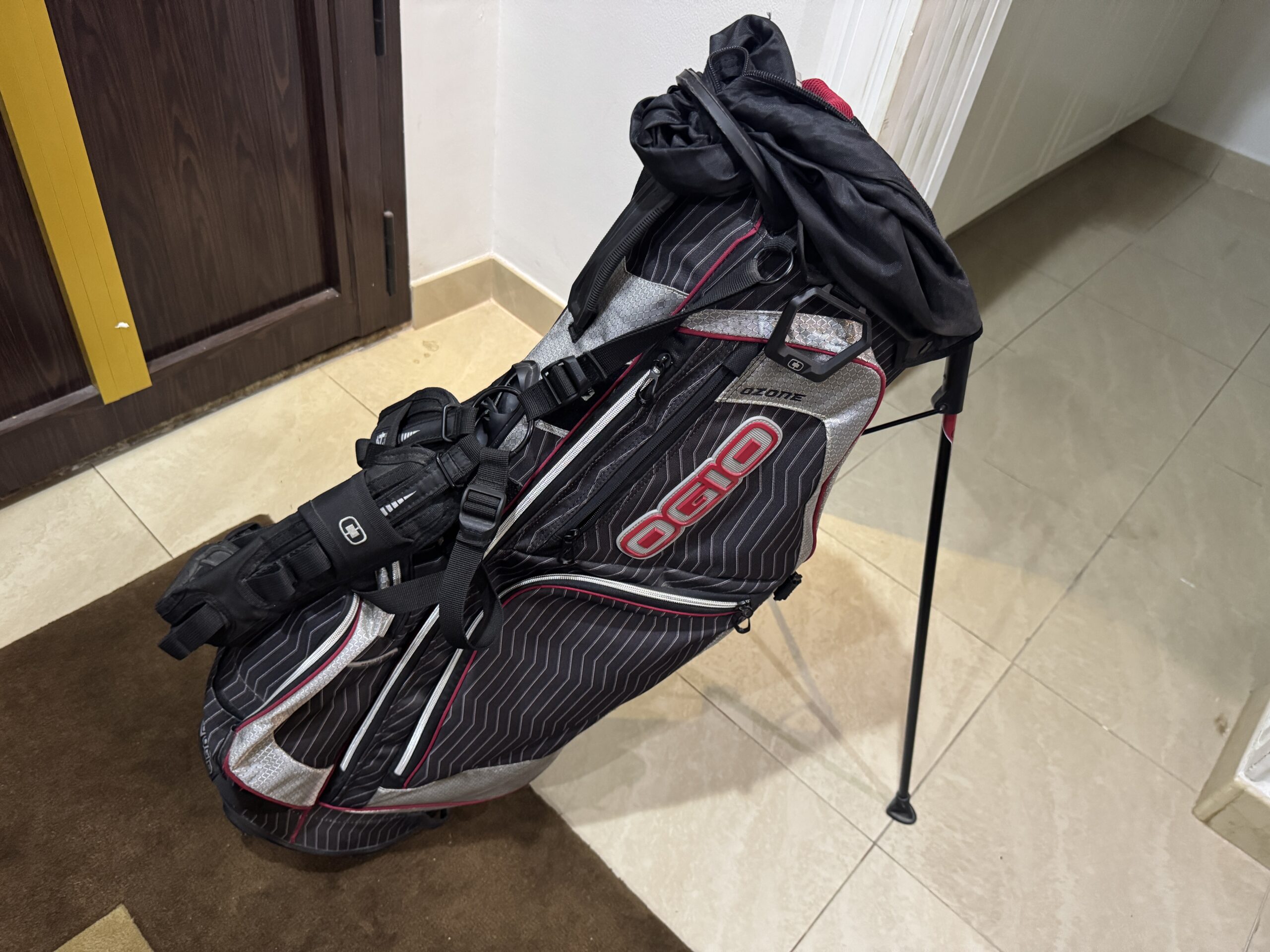OGIO Ozone Stand Bag, Black/White/Red Colourway, 8-Way Partition, with a Detachable Rain Hood/Cover and a SHOXX X4 Double-Strap Carry System.